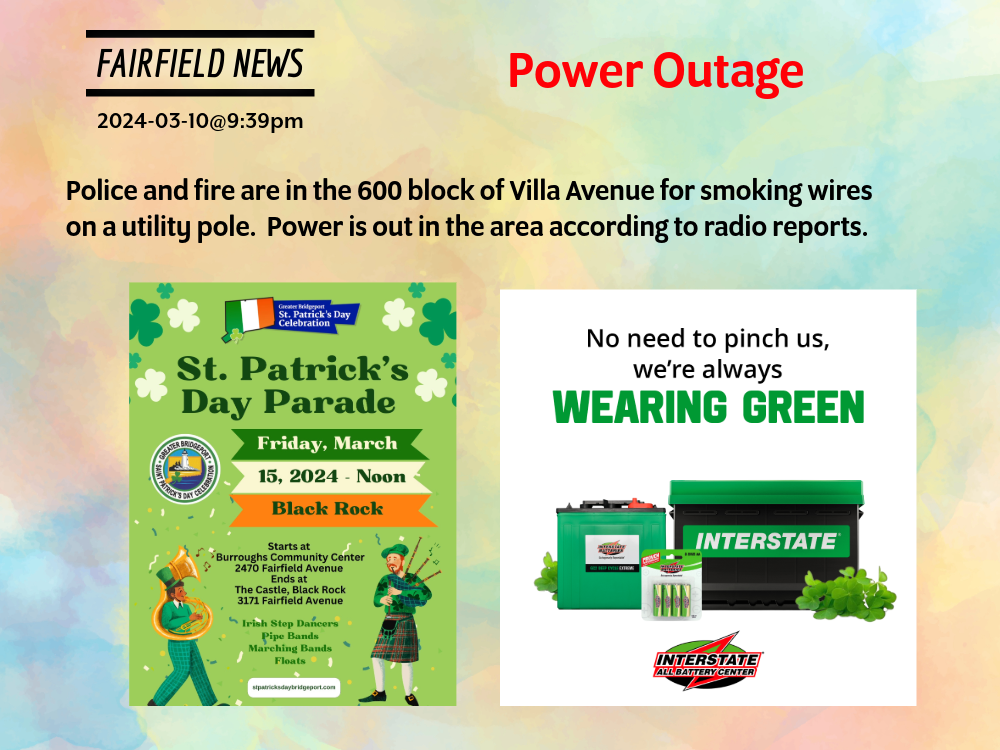 2024-03-10@9:39pm–#Fairfield CT-Police and fire are in the 600 block of Villa Avenue for smoking wires on a utility pole. Power is out in the area according to radio reports.