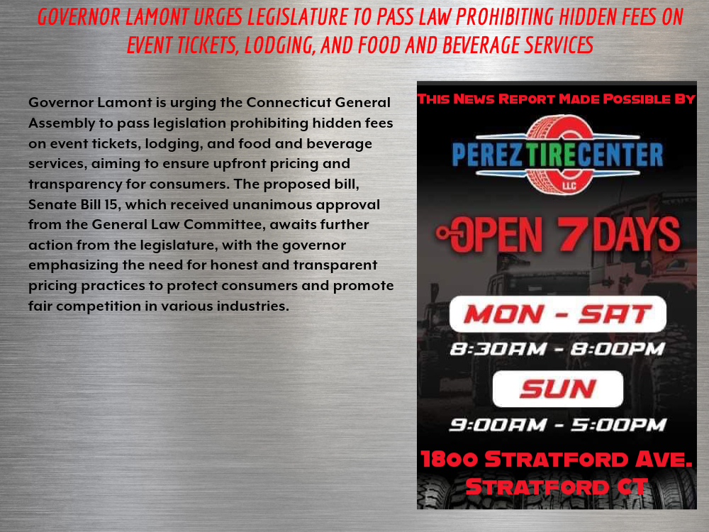 The governor’s proposal is Senate Bill 15, An Act Requiring Fee Disclosures. It was unanimously approved last week by the members of the General Law Committee, and it now awaits further action by both chambers of the General Assembly. The governor is urging them to act on the legislation so that he can sign it into law.