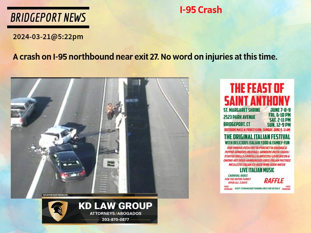 2024-03-21@5:22pm–#Bridgeport CT– #cttraffic– A crash on I-95 northbound near exit 27. No word on injuries at this time.