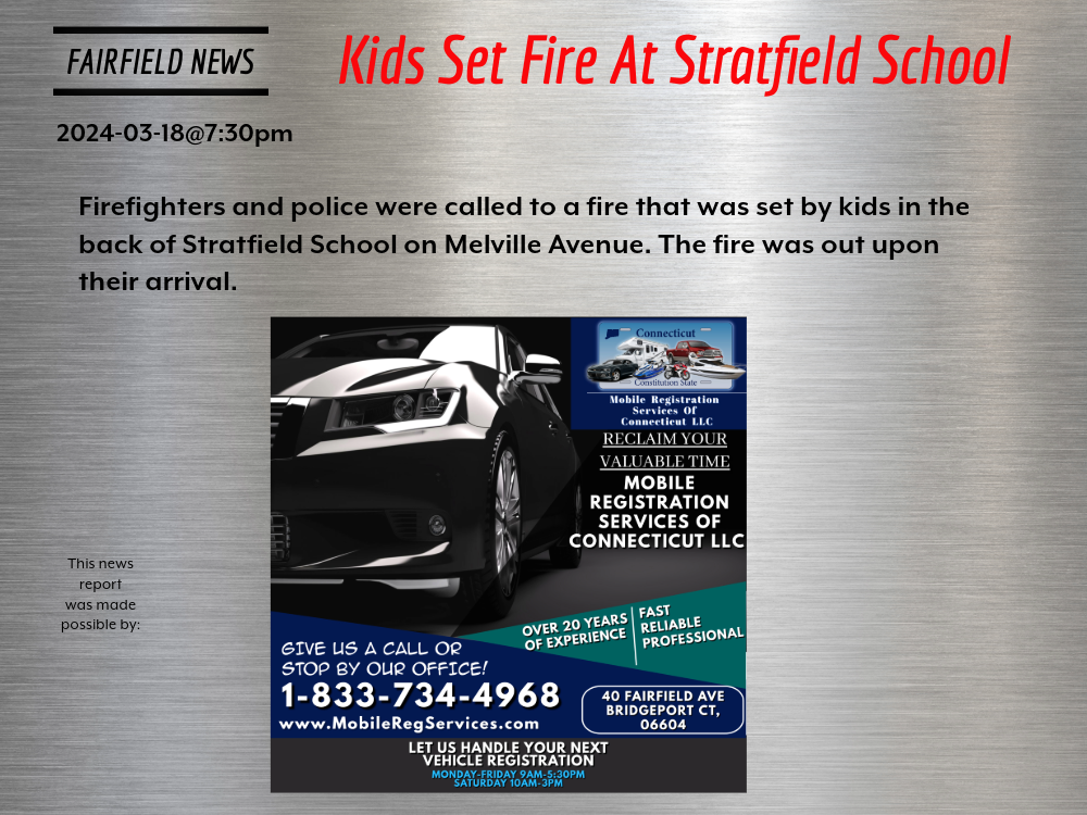 2024-03-18@7:30pm–#Fairfield CT– Firefighters and police were called to a fire that was set by kids in the back of Stratfield School on Melville Avenue. The fire was out upon their arrival.
