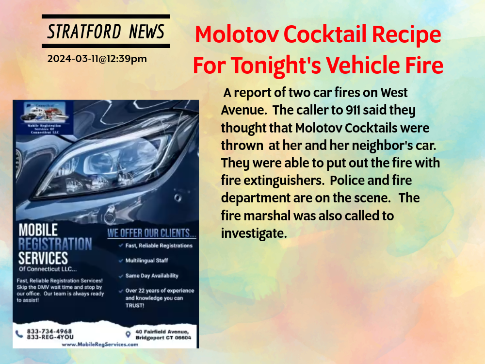 2024-03-11@12:39pm–#Stratford CT– A report of two car fires on West Avenue. The caller to 911 said they thought that Molotov Cocktails were thrown at her and her neighbor’s car. They were able to put out the fire with fire extinguishers. Police and fire department are on the scene. The fire marshal was also called to investigate.