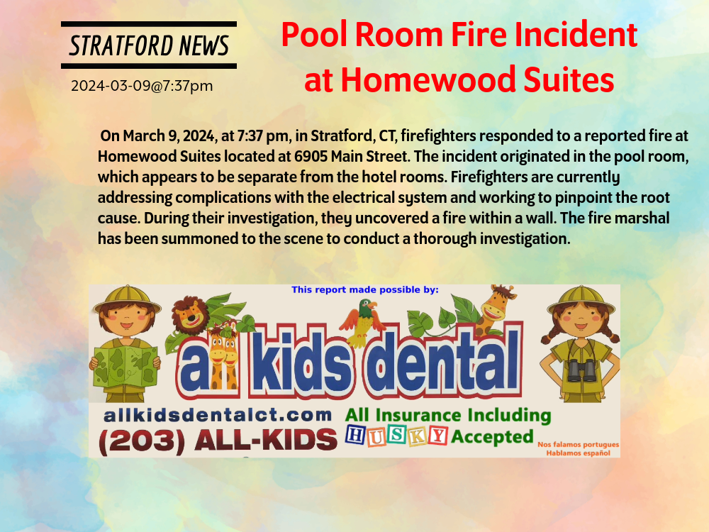 2024-03-09@7:37pm–#Stratford CT– On March 9, 2024, at 7:37 pm, in Stratford, CT, firefighters responded to a reported fire at Homewood Suites located at 6905 Main Street. The incident originated in the pool room, which appears to be separate from the hotel rooms. Firefighters are currently addressing complications with the electrical system and working to pinpoint the root cause. During their investigation, they uncovered a fire within a wall. The fire marshal has been summoned to the scene to conduct a thorough investigation.