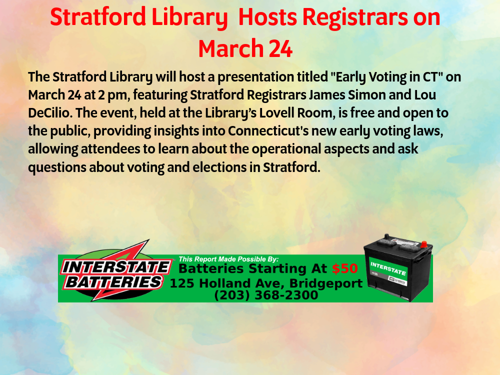 The Stratford Library will host Stratford Registrars James Simon and Lou DeCilio and their presentation, “Early Voting in CT” on Sunday, March 24 at 2 pm. The talk will be presented live in the Library’s Lovell Room. It is free and open to the public.
