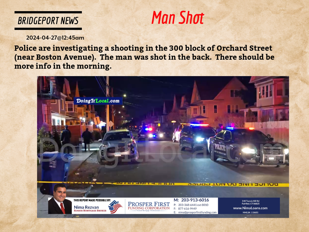 2024-04-27@12:45am–#Bridgeport CT– Police are investigating a shooting in the 300 block of Orchard Street (near Boston Avenue). The man was shot in the back.