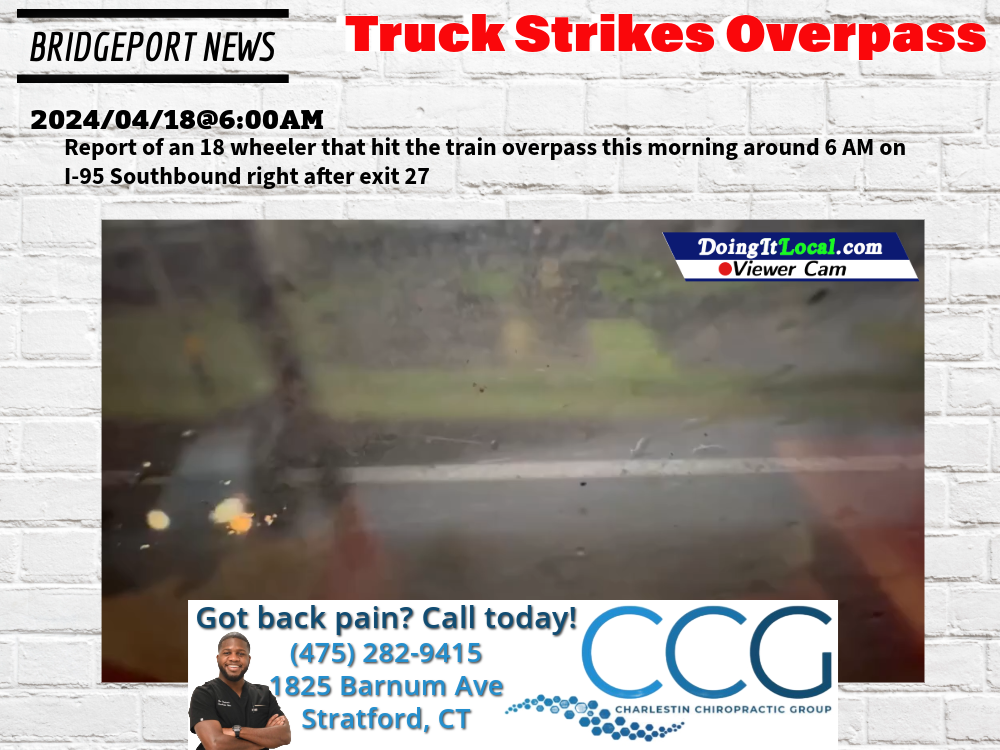 Report of an 18 wheeler that hit the train overpass this morning around 6 AM on I-95 Southbound right after exit 27 Post navigation Westport House Fire Bridgeport News: Arrests made on gun charges