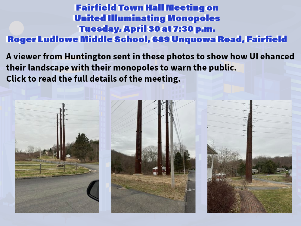 Fairfield Town Hall Meeting on United Illuminating Monopoles Tuesday, April 30 at 7:30 p.m.