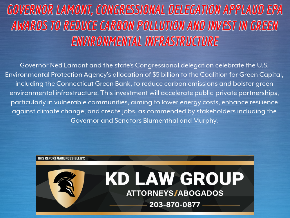(HARTFORD, CT) – Governor Ned Lamont and the members of Connecticut’s Congressional delegation are applauding an announcement made today by the U.S. Environmental Protection Agency (EPA) that $5 billion from the Greenhouse Gas Reduction Fund, which was created under President Joe Biden’s Inflation Reduction Act, is being awarded to the Coalition for Green Capital, a consortium of organizations from throughout the country that includes the Connecticut Green Bank.