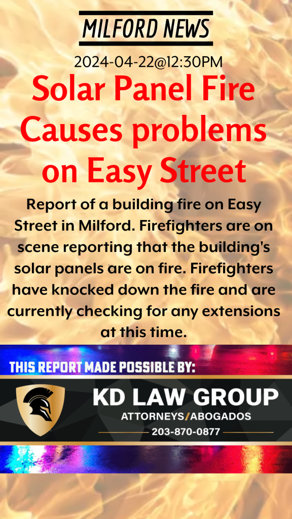 Report of a building fire on Easy Street in Milford. Firefighters are on scene reporting that the building’s solar panels are on fire. Firefighters have knocked down the fire and are currently checking for any extensions at this time.