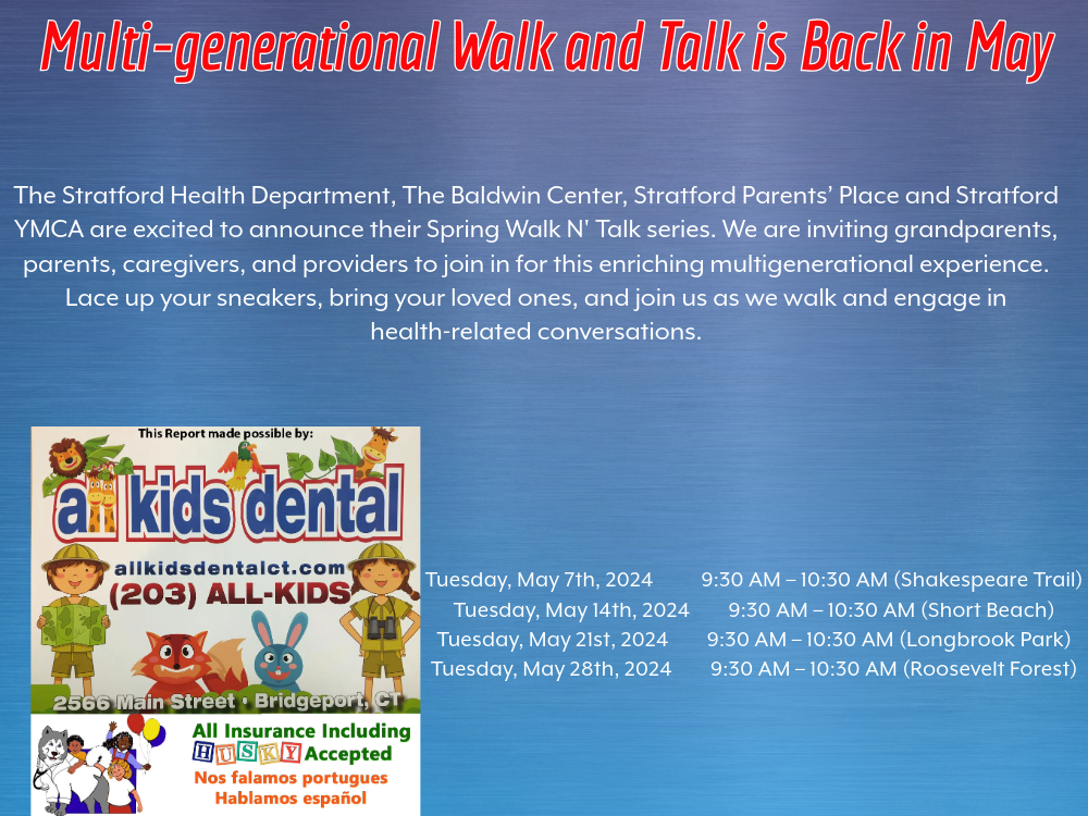 The Stratford Health Department, The Baldwin Center, Stratford Parents’ Place and Stratford YMCA are excited to announce their Spring Walk N' Talk series. We are inviting grandparents, parents, caregivers, and providers to join in for this enriching multigenerational experience. Lace up your sneakers, bring your loved ones, and join us as we walk and engage in health-related conversations. Dates and locations: Tuesday, May 7th, 2024 9:30 AM – 10:30 AM (Shakespeare Trail) Tuesday, May 14th, 2024 9:30 AM – 10:30 AM (Short Beach) Tuesday, May 21st, 2024 9:30 AM – 10:30 AM (Longbrook Park) Tuesday, May 28th, 2024 9:30 AM – 10:30 AM (Roosevelt Forest) The Walk N' Talk sessions will kick off with a 30-minute talking session…
