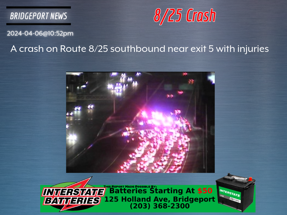 2024-04-06@10:52pm--#Bridgeport CT-- #cttraffic-- A crash on Route 8/25 southbound near exit 5.