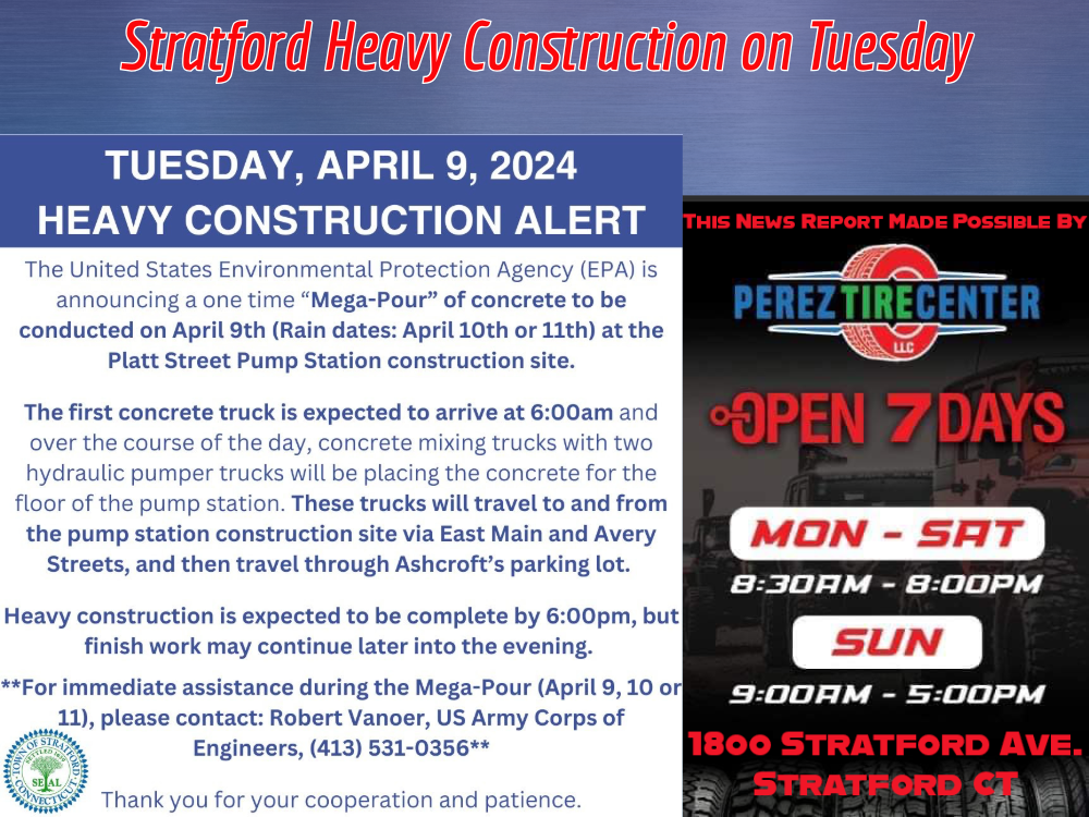 Heavy construction is happening at the Platt Street Pump Station construction site. Expect heavy traffic from 6 AM to 6 PM (though may continue later into the evening) on Tuesday April 9th.