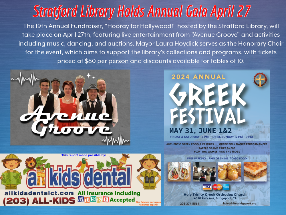 The Stratford Library Board of Trustees will present its annual fundraiser for the library on Saturday, April 27 beginning at 6:30 pm. The nineteenth annual gala event entitled “Hooray for Hollywood” will offer “Avenue Groove”, a six piece R&B/Funk band as this year’s entertainment. “Hooray for Hollywood” is an evening of music, dancing, appetizers, dinner and fine beverages. Guests are encouraged to “dress Hollywood” for an entry to win a prize. A silent online and in-person auction and a 50/50 raffle will also be included in the festivities. Those unable to attend the benefit may support the Library by going online to make their auction bids. This year’s event will be held at Blackhawk County Club, 385 Oronoque Lane in…