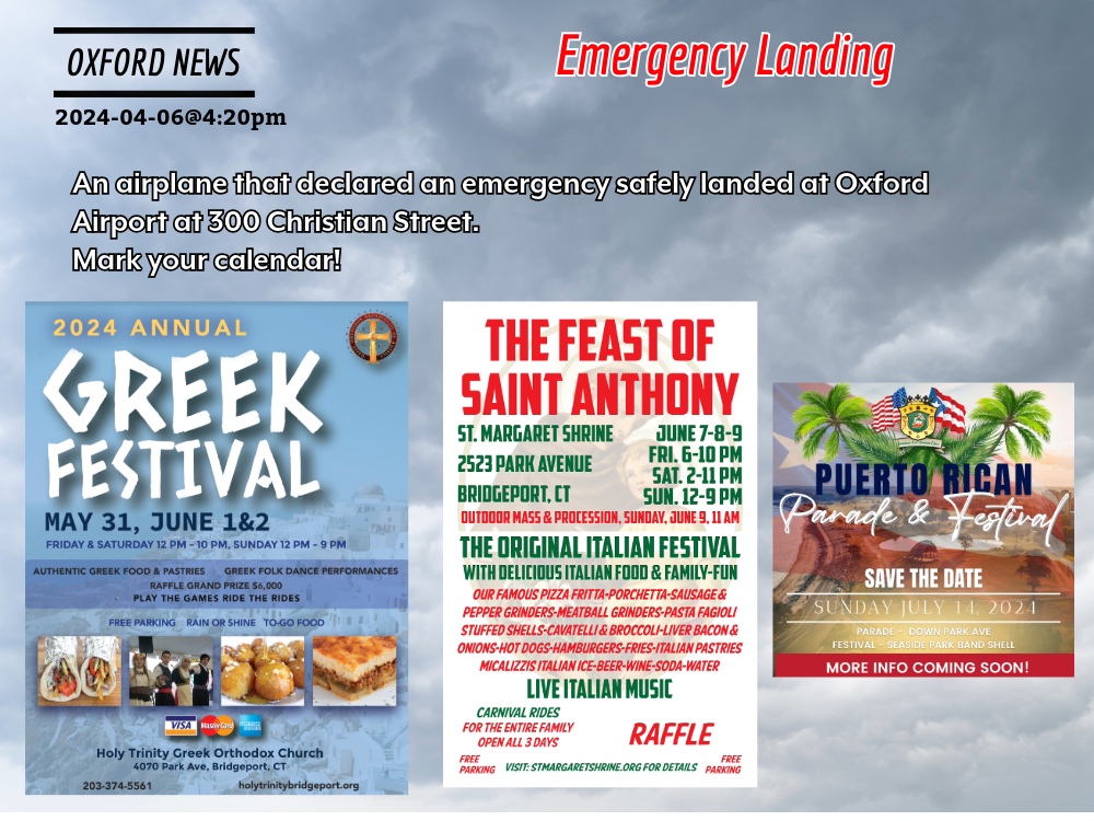 2024-04-06@4:20pm--#Oxford CT-- An airplane that declared an emergency safely landed at Oxford Airport at 300 Christian Street.