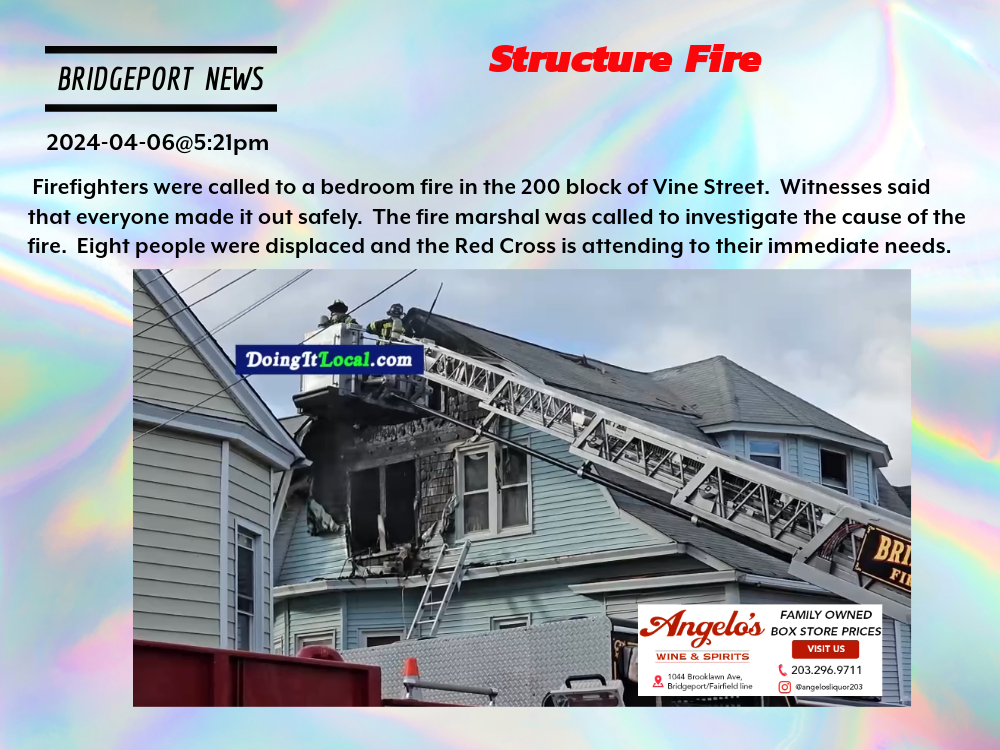 2024-04-06@5:21pm--#Bridgeport CT-- #ctfire-- Firefighters were called to a bedroom fire in the 200 block of Vine Street. Witnesses said that everyone made it out safely. The fire marshal was called to investigate the cause of the fire. Eight people were displaced and the Red Cross is attending to their immediate needs.