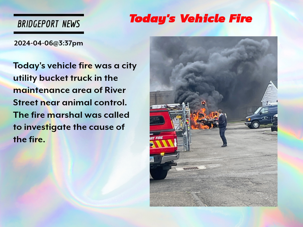 2024-04-06@3:37pm--#Bridgeport CT-- Today's vehicle fire was a city utility bucket truck in the maintenance area of River Street near animal control. The fire marshal was called to investigate the cause of the fire.