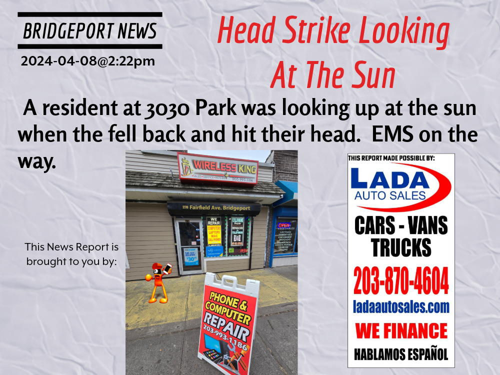2024-04-08@2:22pm--#Bridgeport CT-- A resident at 3030 Park was looking up at the sun when the fell back and hit their head. EMS on the way.