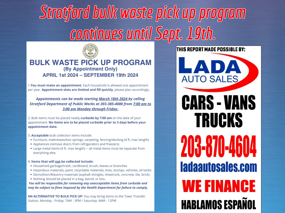 By appointment only, you can call the Stratford Department of Public Works (203) 385-4080 from 7 AM to 3 PM Monday through Friday for removal of bulk collection items such as furniture, mattresses and box springs, appliances, etc. Please note that household trash, branches, hazardous materials, anything in boxes barrels or bags, or demolition materials will not be accepted.