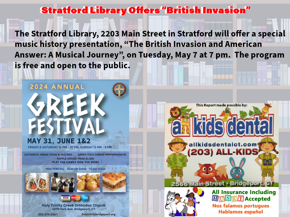 The Stratford Library, 2203 Main Street in Stratford will offer a special music history presentation, “The British Invasion and American Answer: A Musical Journey”, on Tuesday, May 7 at 7 pm. The program is free and open to the public.