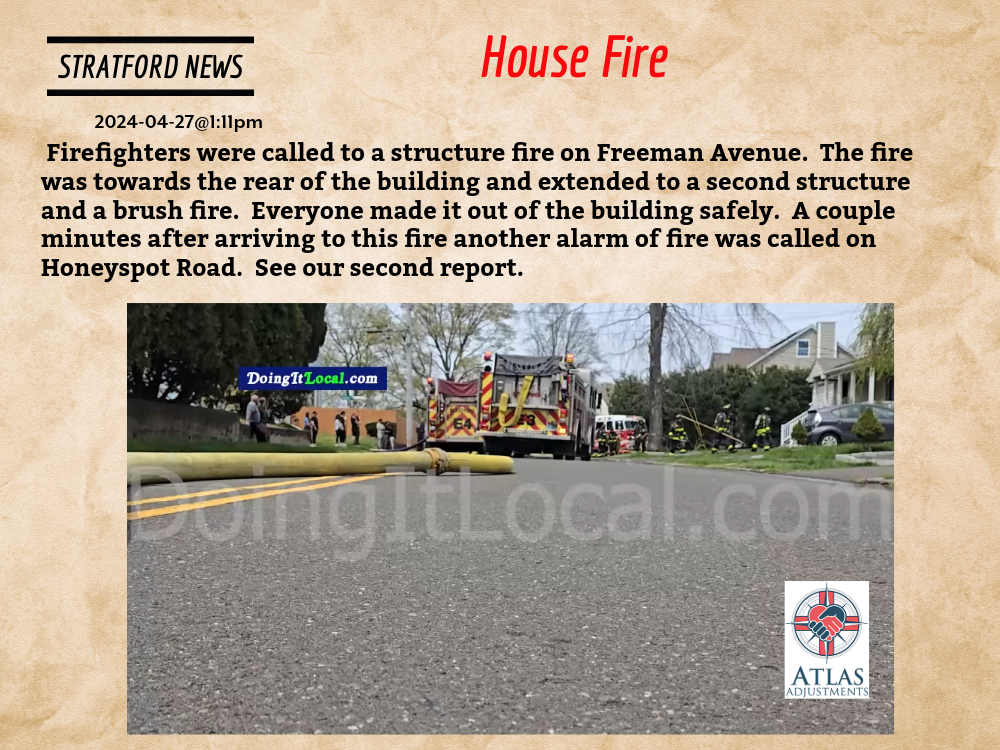 2024-04-27@1:11pm–#Stratford CT– Firefighters were called to a structure fire on Freeman Avenue. The fire was towards the rear of the building and extended to a second structure and a brush fire. Everyone made it out of the building safely. A couple minutes after arriving to this fire another alarm of fire was called on Honeyspot Road. See our second report.