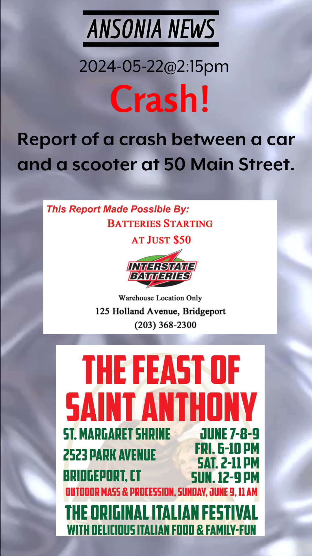 2024-05-22@3:19pm–#Ansoinia CT– Report of a crash between a car and a scooter at 50 Main Street.