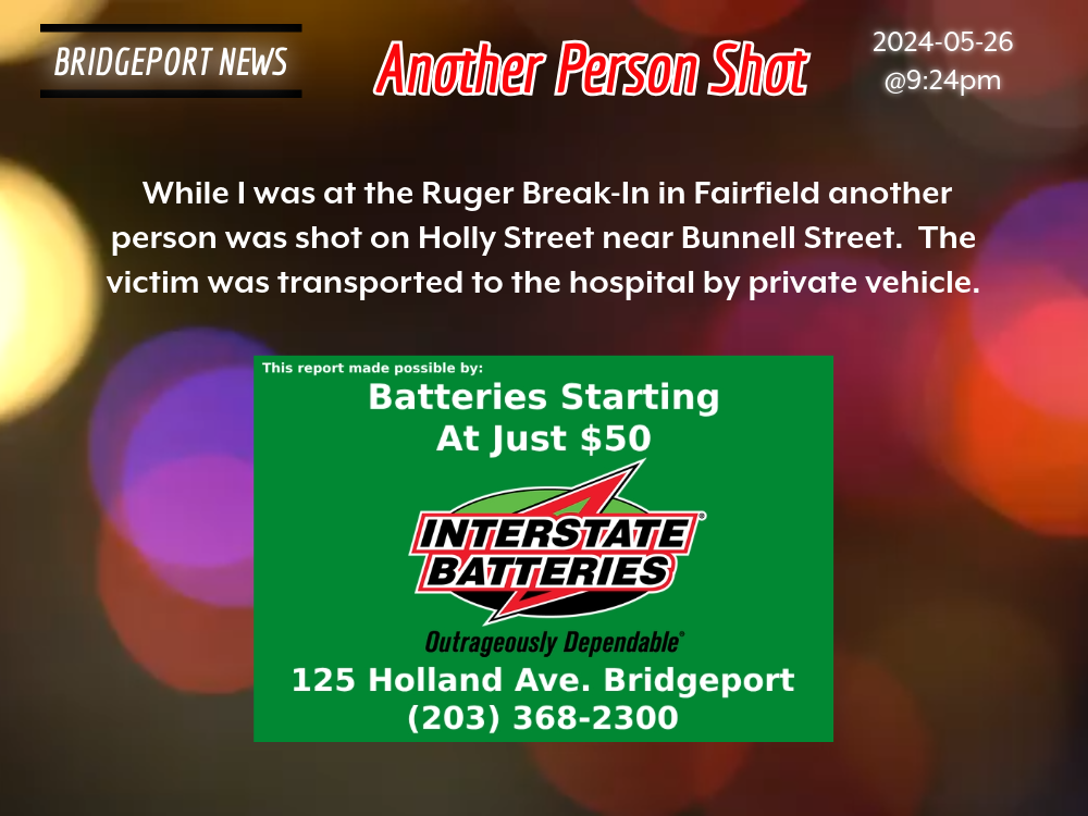2024-05-26@1AMish–#Bridgeport CT– While I was at the Ruger Break-In in Fairfield another person was shot on Holly Street near Bunnell Street. The victim was transported to the hospital by private vehicle.
