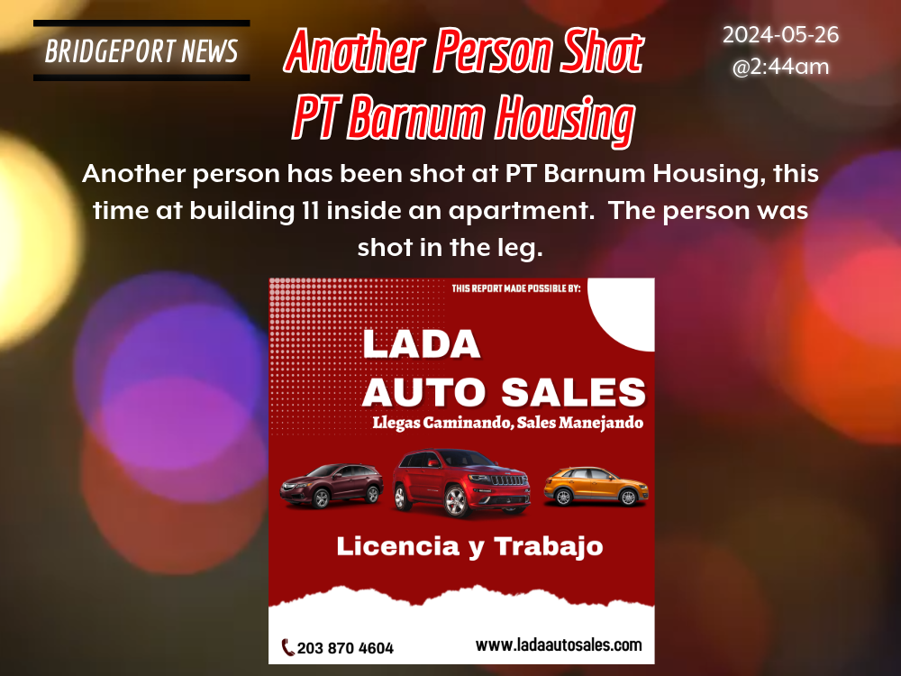 2024-05-26@2:44am–#Bridgeport News: Another person has been shot at PT Barnum Housing, this time at building 11 inside an apartment. The person was shot in the leg.