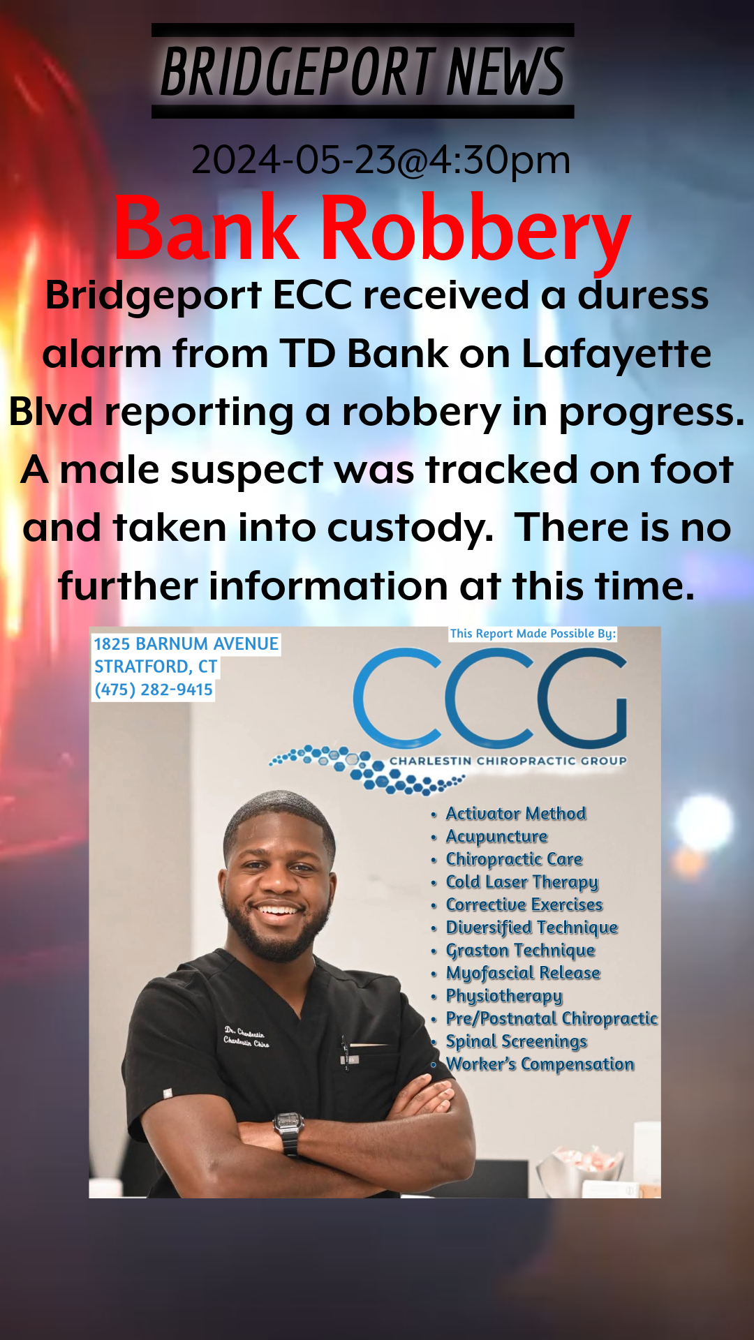 Bridgeport ECC received a duress alarm from TD Bank on Lafayette Blvd reporting a robbery in progress. A male suspect was tracked on foot and taken into custody. There is no further information at this time.