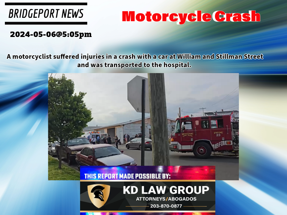 2024-05-06@5:05pm–#Bridgeport CT– A motorcyclist suffered injuries in a crash with a car at William and Stillman Street and was transported to the hospital.