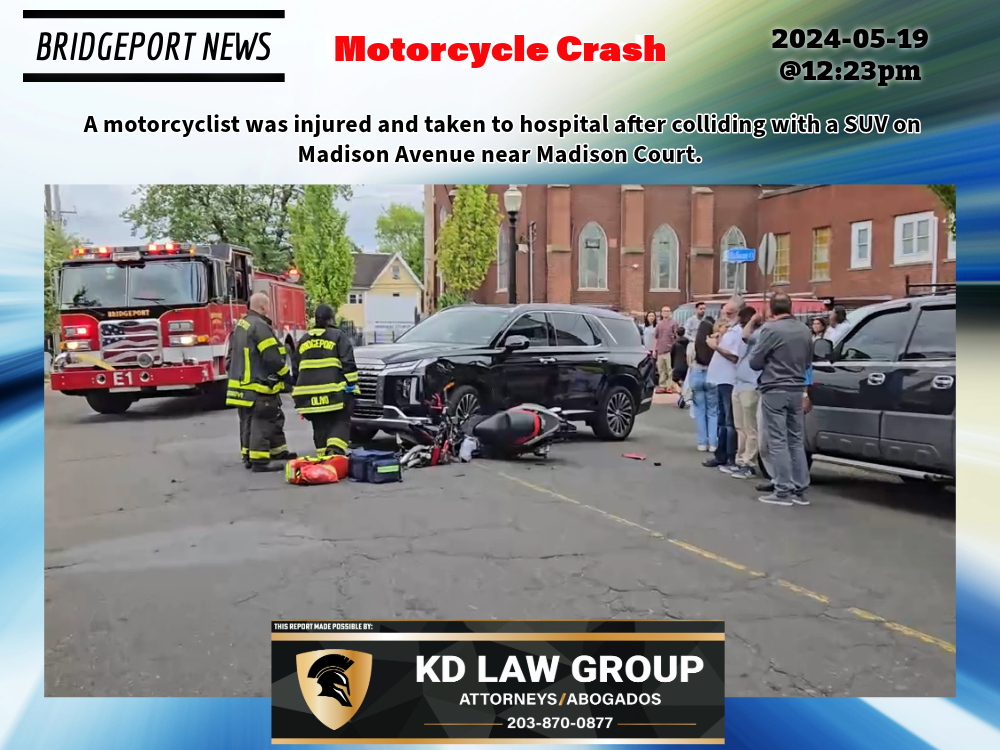 2024-05-19@12:23pm–#Bridgeport CT– A motorcyclist was injured and taken to hospital after colliding with a SUV on Madison Avenue near Madison Court.