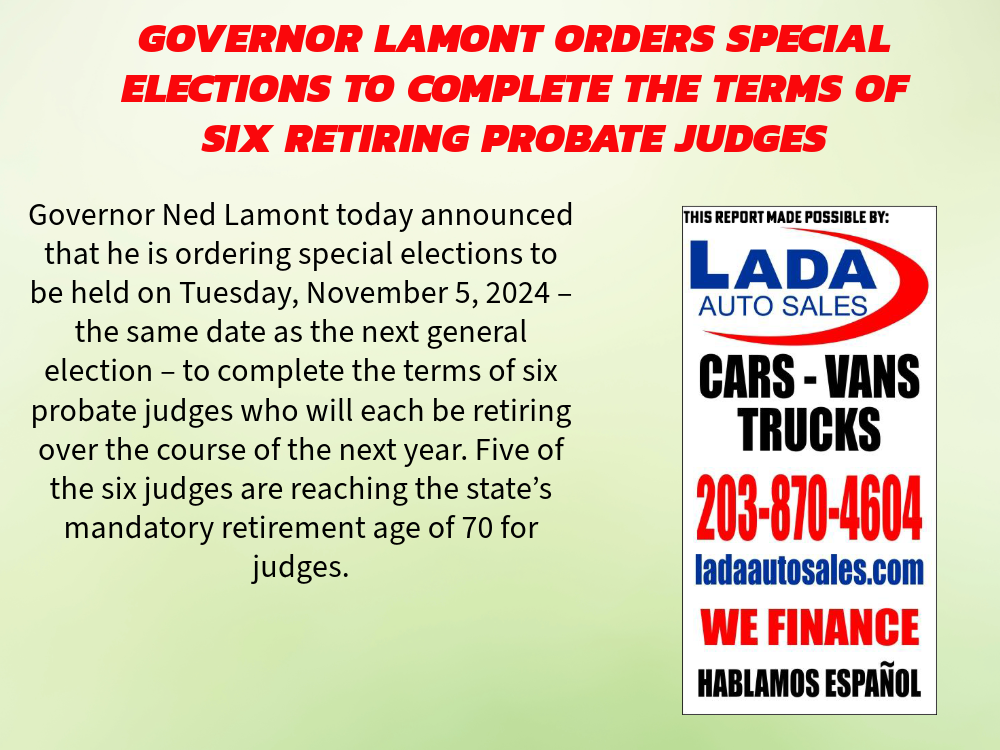 (HARTFORD, CT) – Governor Ned Lamont today announced that he is ordering special elections to be held on Tuesday, November 5, 2024 – the same date as the next general election – to complete the terms of six probate judges who will each be retiring over the course of the next year. Five of the six judges are reaching the state’s mandatory retirement age of 70 for judges.