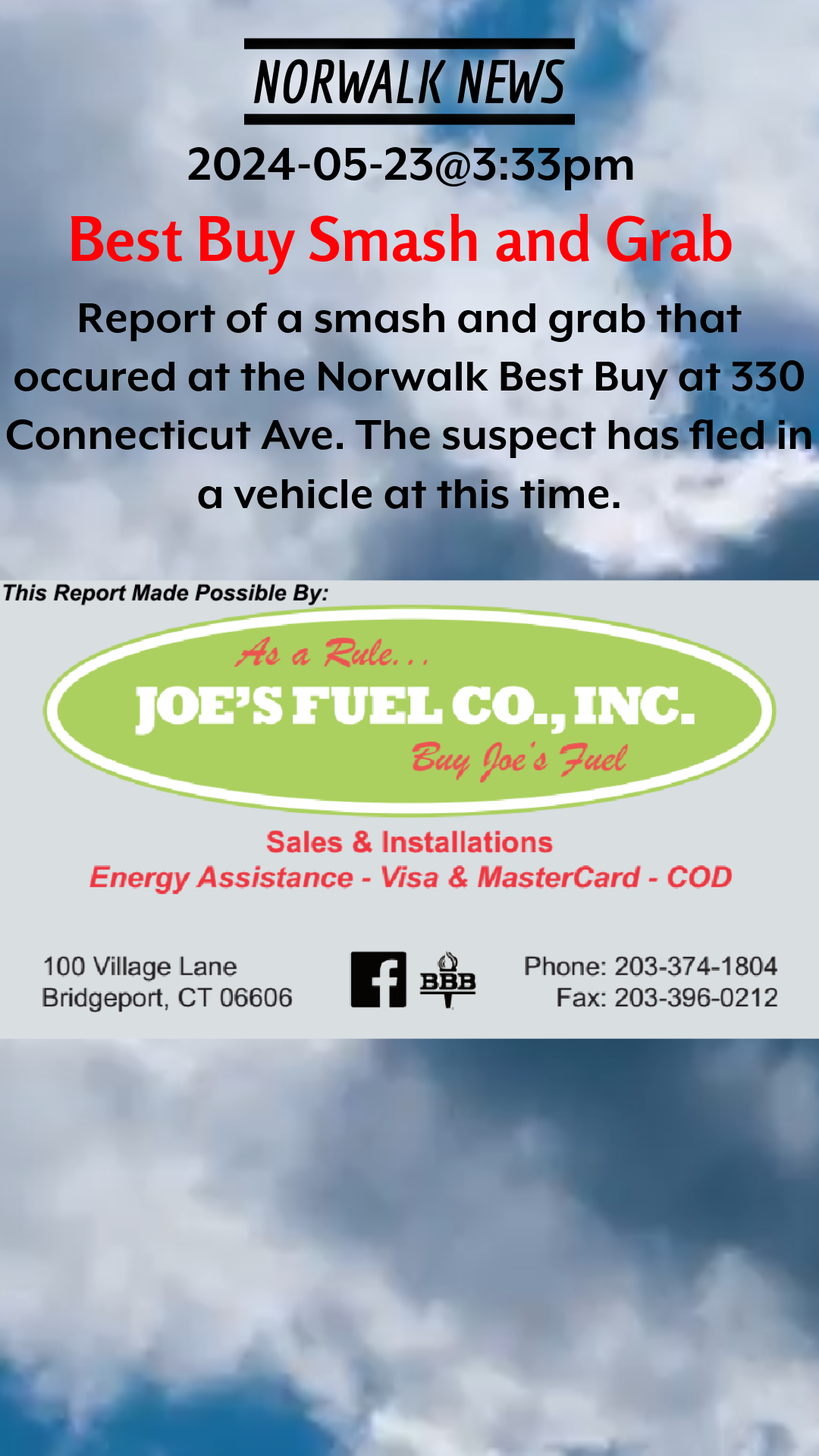 Report of a smash and grab that occurred at the Norwalk Best Buy at 330 Connecticut Ave. The suspect has fled in a vehicle at this time.
