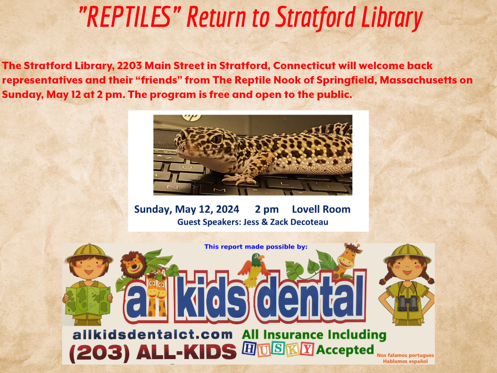 The Stratford Library, 2203 Main Street in Stratford, Connecticut will welcome back representatives and their “friends” from The Reptile Nook of Springfield, Massachusetts on Sunday, May 12 at 2 pm. The program is free and open to the public. Fascinating animal talk from guest speakers Jess and Zack Decoteau, animal keepers and educators from The Reptile Nook, will showcase a variety of reptiles for the program including Ralphie, the Bearded Dragon, Bluey, the Blue-Tongued Skink, Cream, the Corn Snake and Taco, the Cane Toad. The Reptile Nook is dedicated to teaching people of all ages about reptiles and amphibians hoping to help people both face their fears of these misunderstood creatures and to love and appreciate animals of all kinds. “The…