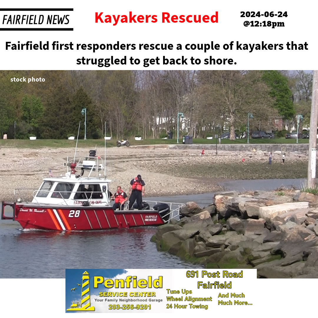 2024-06-24@12:18pm–#Fairfield CT–Fairfield first responders rescue a couple of kayakers that struggled to get back to shore.