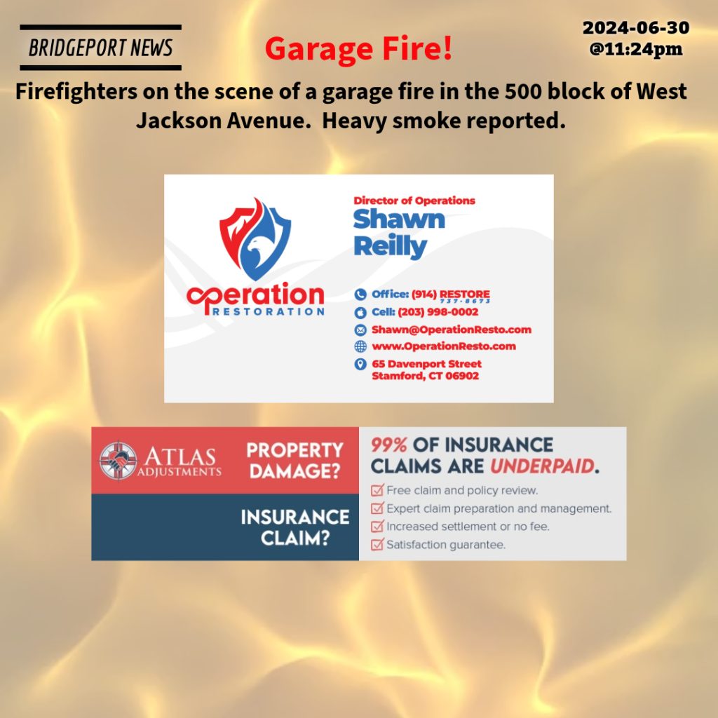 2024-06-30@11:24pm–#Bridgeport CT– Firefighters on the scene of a garage fire in the 500 block of West Jackson Avenue. Heavy smoke reported
