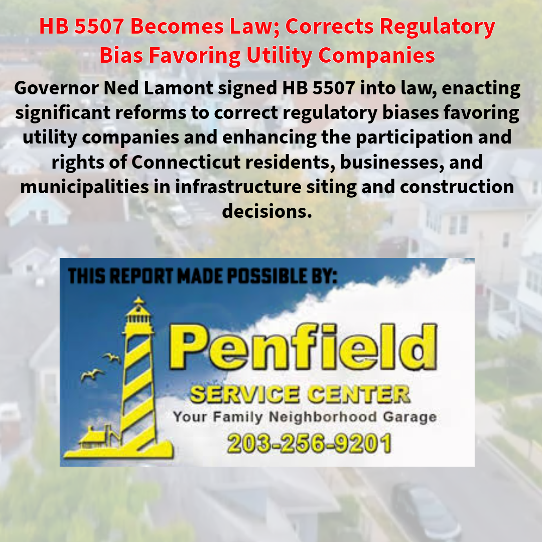 Fairfield, CT, June 12, 2024 – Yesterday, Governor Ned Lamont officially signed HB 5507, a significant piece of legislation correcting regulatory bias currently favoring utility companies, into law. HB 5507—An Act Concerning State Agency and Court Proceedings Relating to Electric Transmission Lines—now ensures a fairer balance with the needs and rights of Connecticut residents, businesses, and municipalities in matters relating to infrastructure siting, use of land, and construction. The governor’s signature signals the most significant change to the regulations governing the Connecticut Siting Council (CSC) since its creation in 1981 under Connecticut Public Act 81-369.