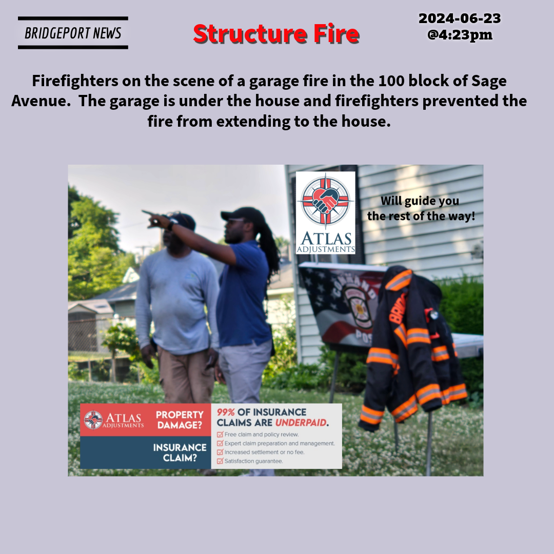 2024-06-23@4:23pm--#Bridgeport CT-- Firefighters on the scene of a garage fire in the 100 block of Sage Avenue. The garage is under the house and firefighters prevented the fire from extending to the house.