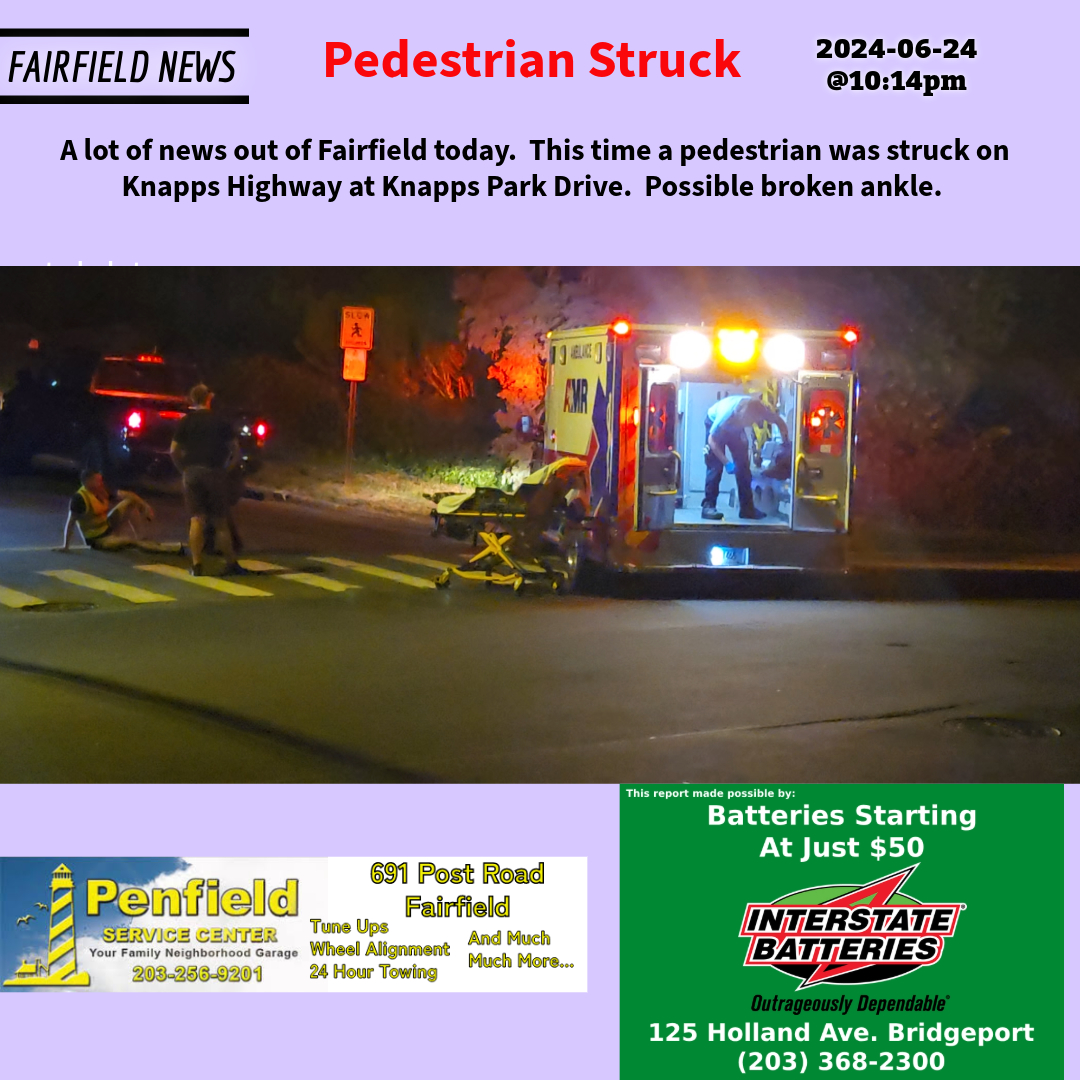 2024-06-24@10:14pm--#Fairfield CT-- A lot of news out of Fairfield today. This time a pedestrian was struck on Knapps Highway at Knapps Park Drive. Possible broken ankle.