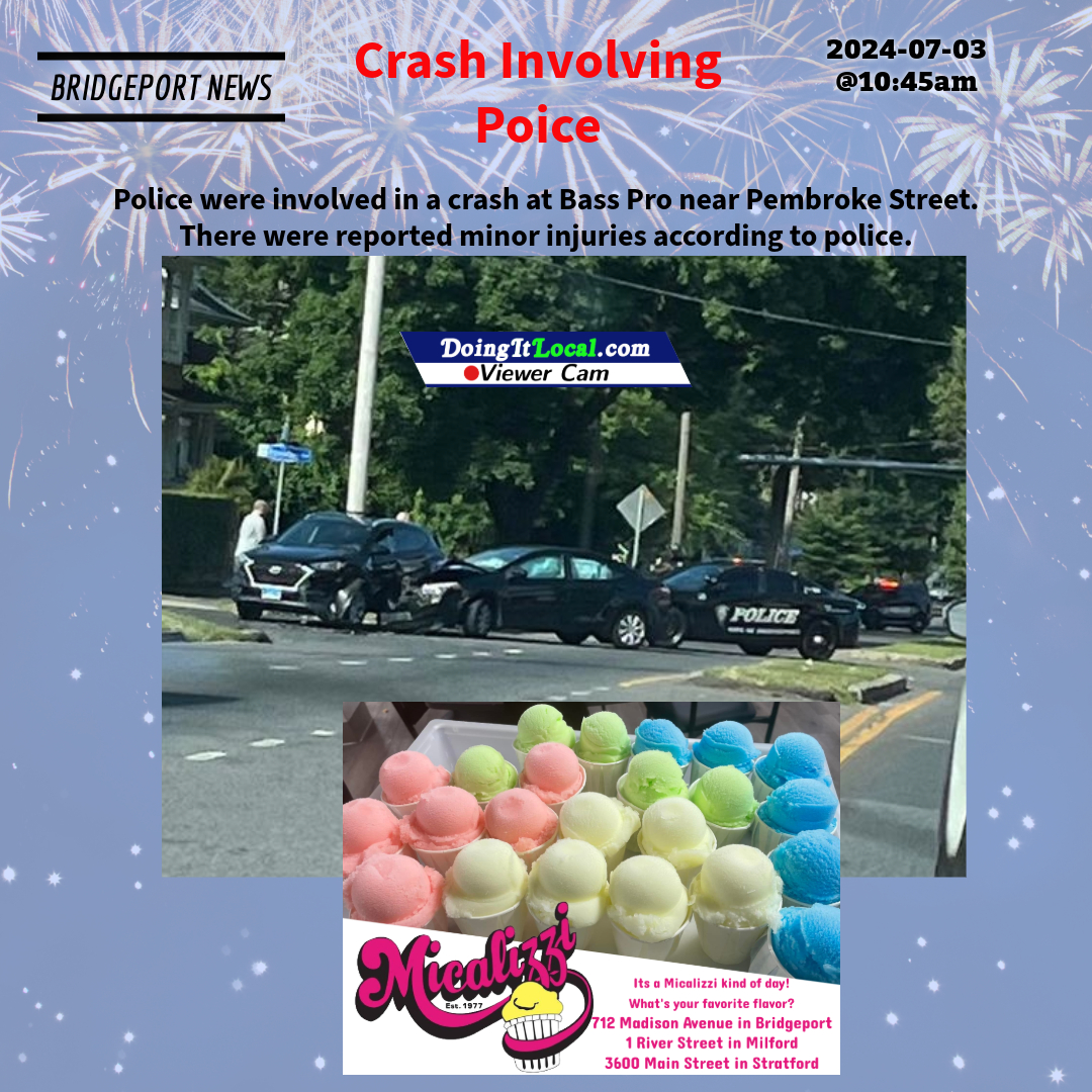 2024-07-03@10:45am–#Bridgeport CT– Police were involved in a crash at Bass Pro near Pembroke Street. There were reported minor injuries according to police.