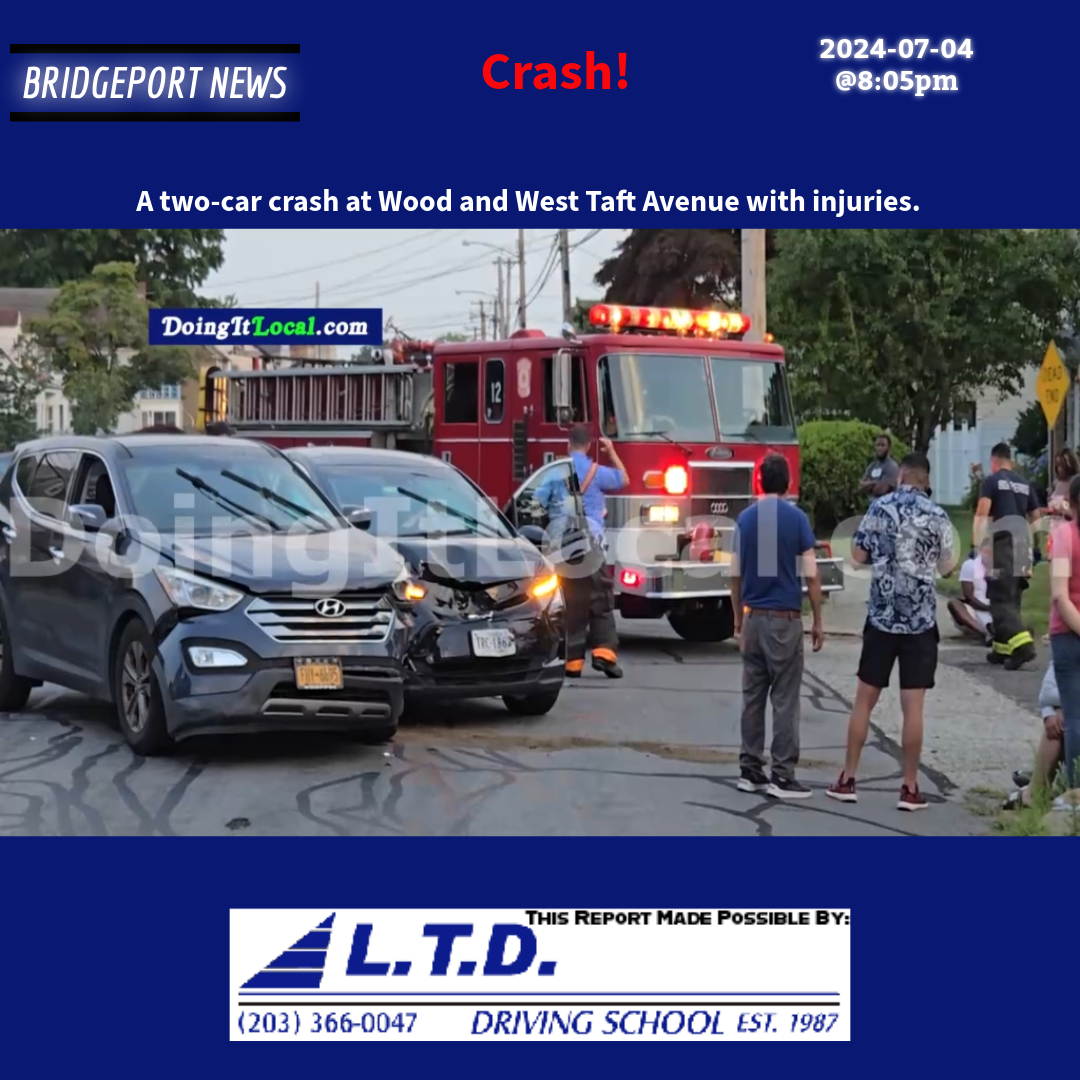 2024-07-04@8:05pm–#Bridgeport CT– A two-car crash at Wood and West Taft Avenue with injuries.