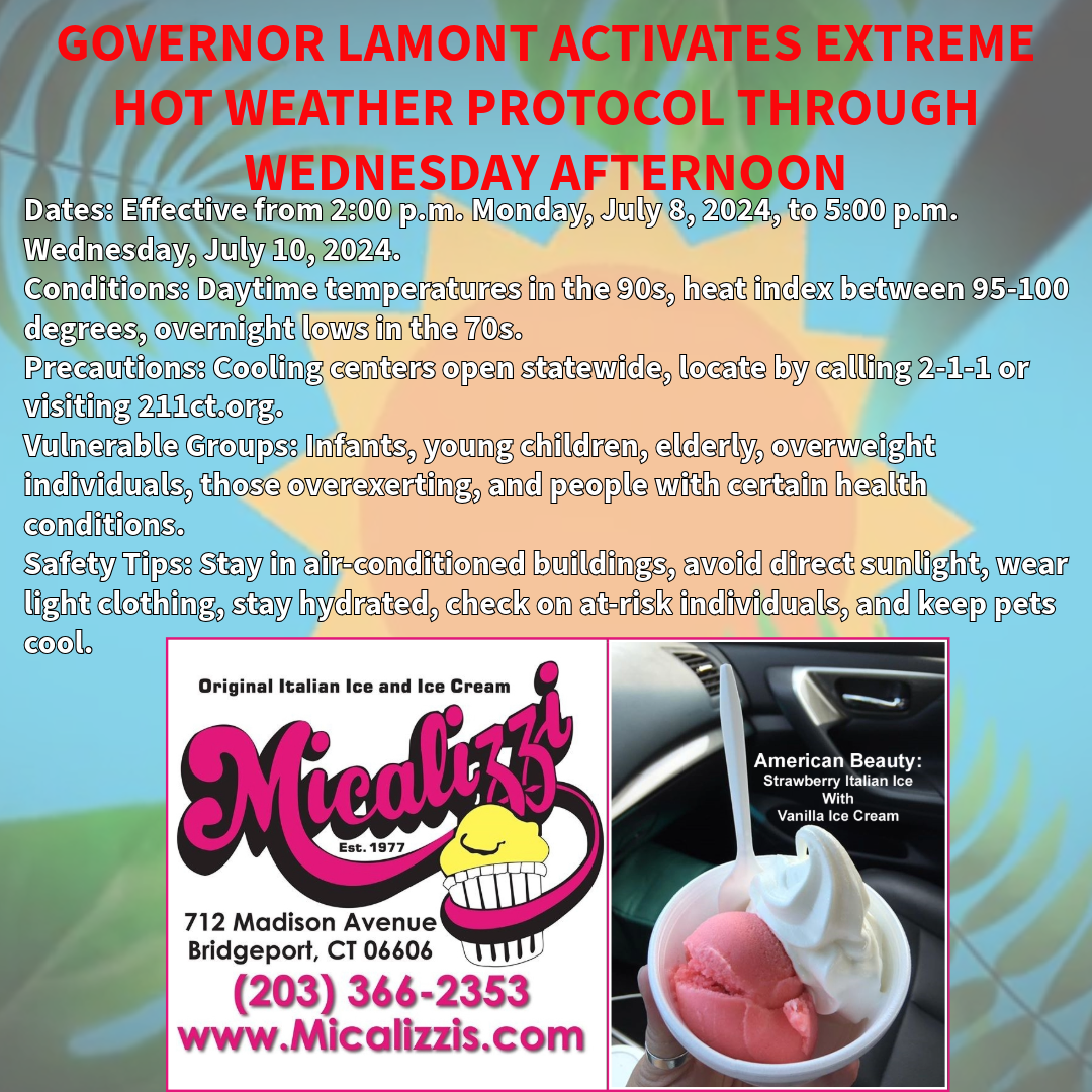 (HARTFORD, CT) – Governor Ned Lamont today announced that due to a weather forecast indicating that Connecticut will experience very hot and humid temperatures over the next several days, he is directing Connecticut’s Extreme Hot Weather Protocol to be activated effective at 2:00 p.m. on Monday, July 8, 2024, and remaining in effect through 5:00 p.m. on Wednesday, July 10, 2024.