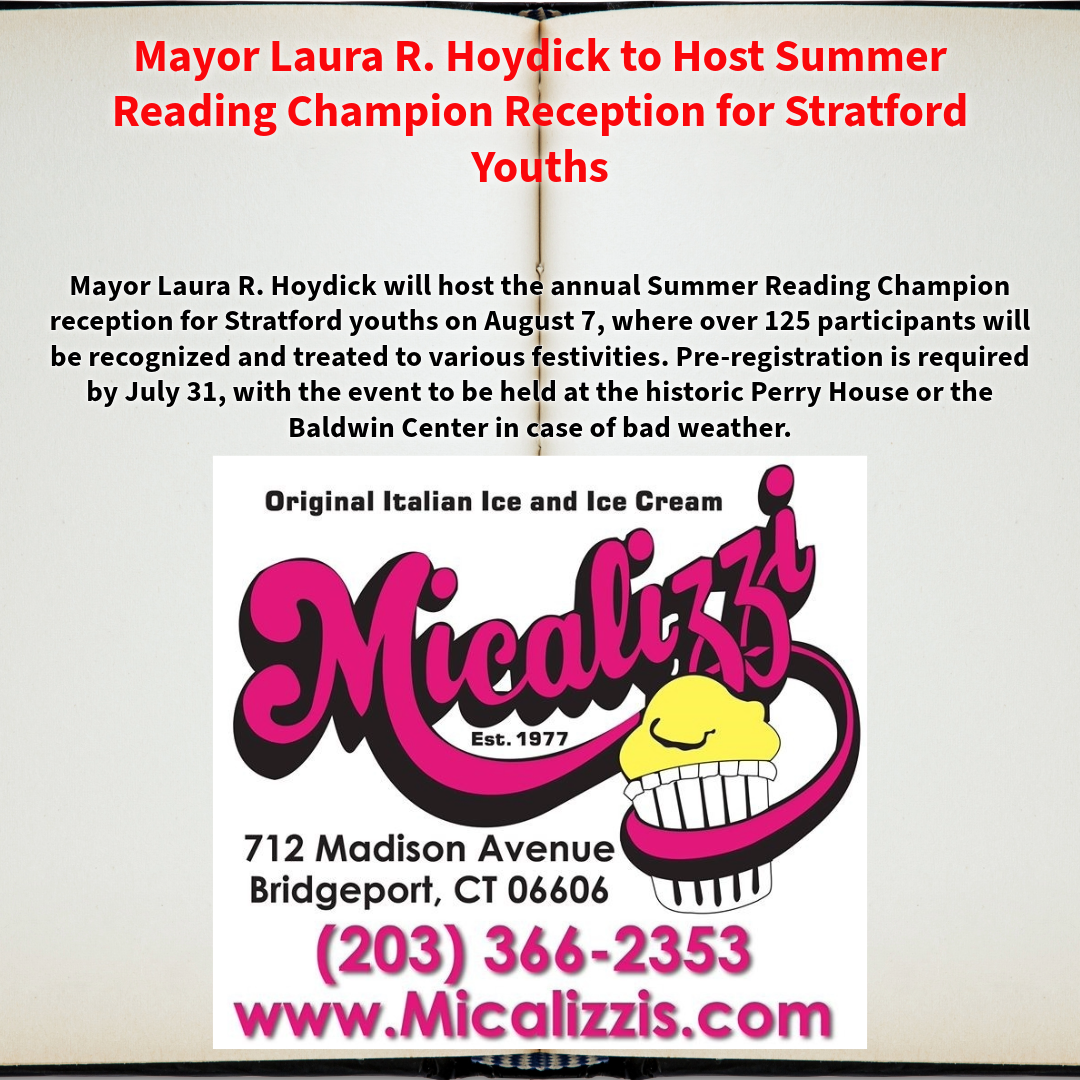 STRATFORD – As we move into the second half of summer, Mayor Laura R. Hoydick is preparing to recognize Stratford youths at the annual Summer Reading Champion reception on Wednesday, August 7, from 3:30 to 5:30 PM outside the historic Perry House, 1128 West Broad Street. Over 125 Stratford youths will be honored with a Mayor’s Reading Champion certificate of recognition at the Summer Reading Challenge celebration, where Champions will be treated to ice cream sundaes, goodie bags, and other surprises. This is a drop-in event; families are welcome to stop by any time between 3:30 to 5:30 PM. Pre-registration is required and can be found at https://www.stratfordct.gov/page/mayors-summer-reading-champion. Registration closes on July 31.