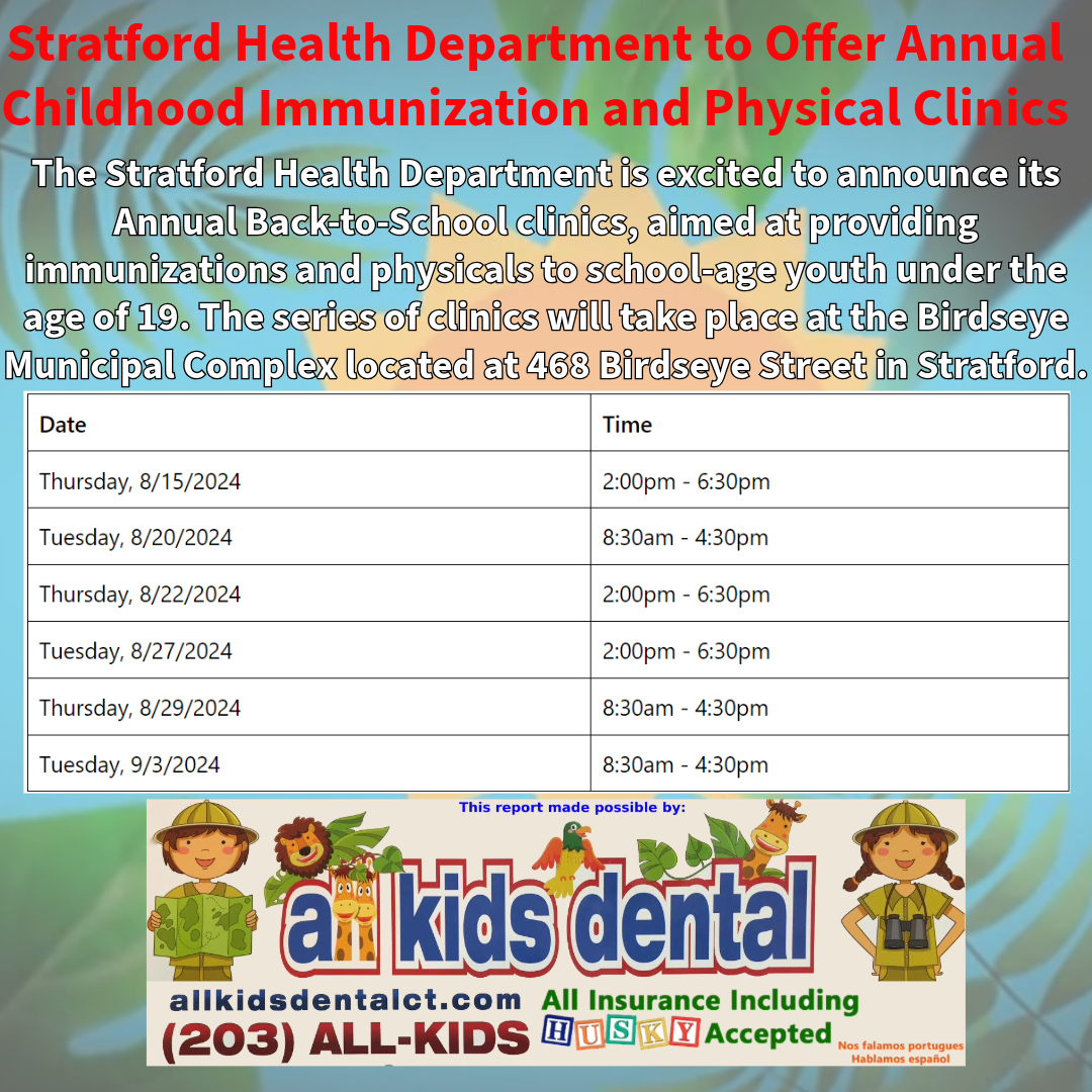 The Stratford Health Department is excited to announce its Annual Back-to-School clinics, aimed at providing immunizations and physicals to school-age youth under the age of 19. The series of clinics will take place at the Birdseye Municipal Complex located at 468 Birdseye Street in Stratford.