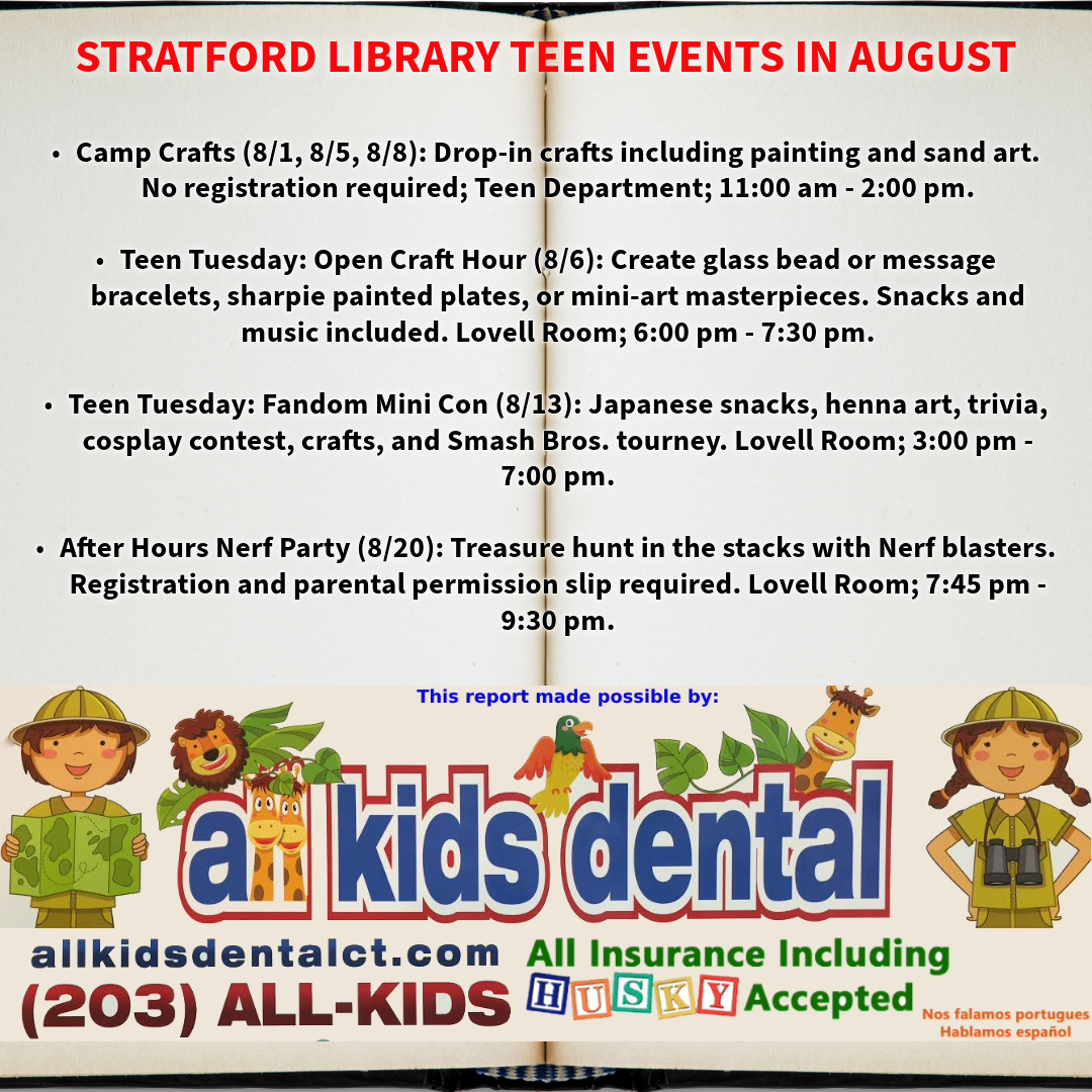 8/6: 6:00 – 7:30 pm. Teen Tuesday: Open Craft Hour: Make your own glass bead or message bracelets, try sharpie painted personalized plates, or create your own mini-art masterpiece with acrylics. Of course, there will be snacks and music because it is a Teen Tuesday! No registration required; for grades 7-13. Location: Lovell Room.