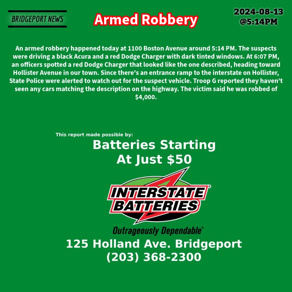 An armed robbery happened today at 1100 Boston Avenue around 5:14 PM. The suspects were driving a black Acura and a red Dodge Charger with dark tinted windows. At 6:07 PM, an officer spotted a red Dodge Charger that looked like the one described, heading toward Hollister Avenue in our town. Since there’s an entrance ramp to the interstate on Hollister, State Police were alerted to watch out for the suspect vehicle. Troop G reported they haven’t seen any cars matching the description on the highway. The victim said he was robbed of $4,000.