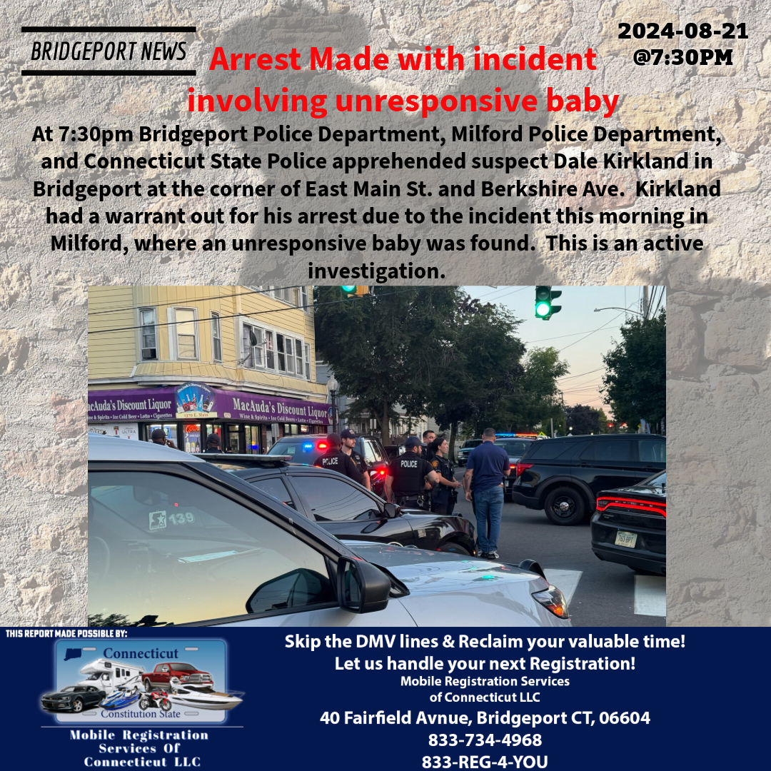 At 7:30pm Bridgeport Police Department, Milford Police Department, and Connecticut State Police apprehended suspect Dale Kirkland in Bridgeport at the corner of East Main St. and Berkshire Ave. Kirkland had a warrant out for his arrest due to the incident this morning in Milford, where an unresponsive baby was found. This is an active investigation.