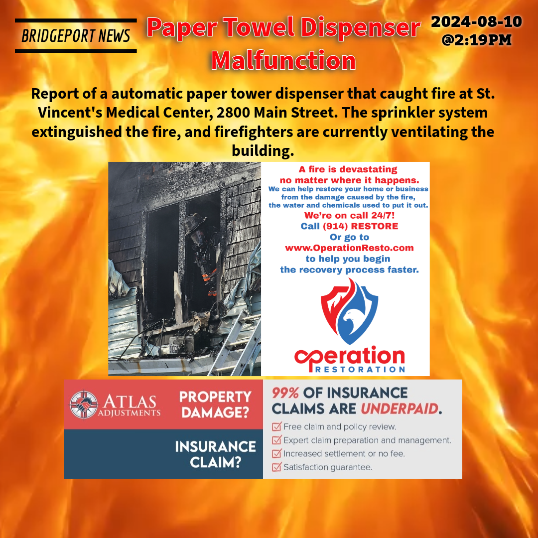 Report of a automatic paper tower dispenser that caught fire at St. Vincent’s Medical Center, 2800 Main Street. The sprinkler system extinguished the fire, and firefighters are currently ventilating the building.