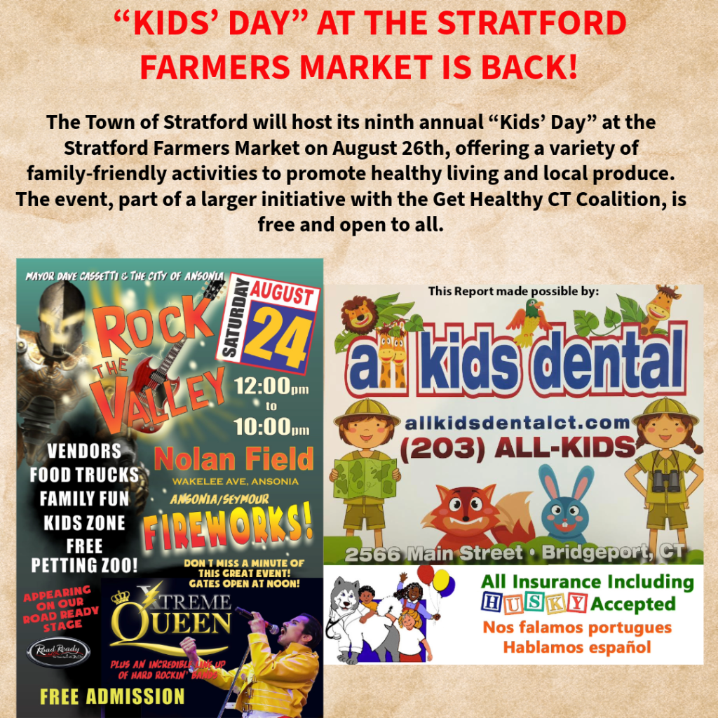 STRATFORD, CT, August 8, 2024—The Town of Stratford will be hosting its ninth annual “Kids’ Day” at the Stratford Farmers Market on Monday, August 26th from 2:00 – 6:00 p.m. at Paradise Green in Stratford, CT.
