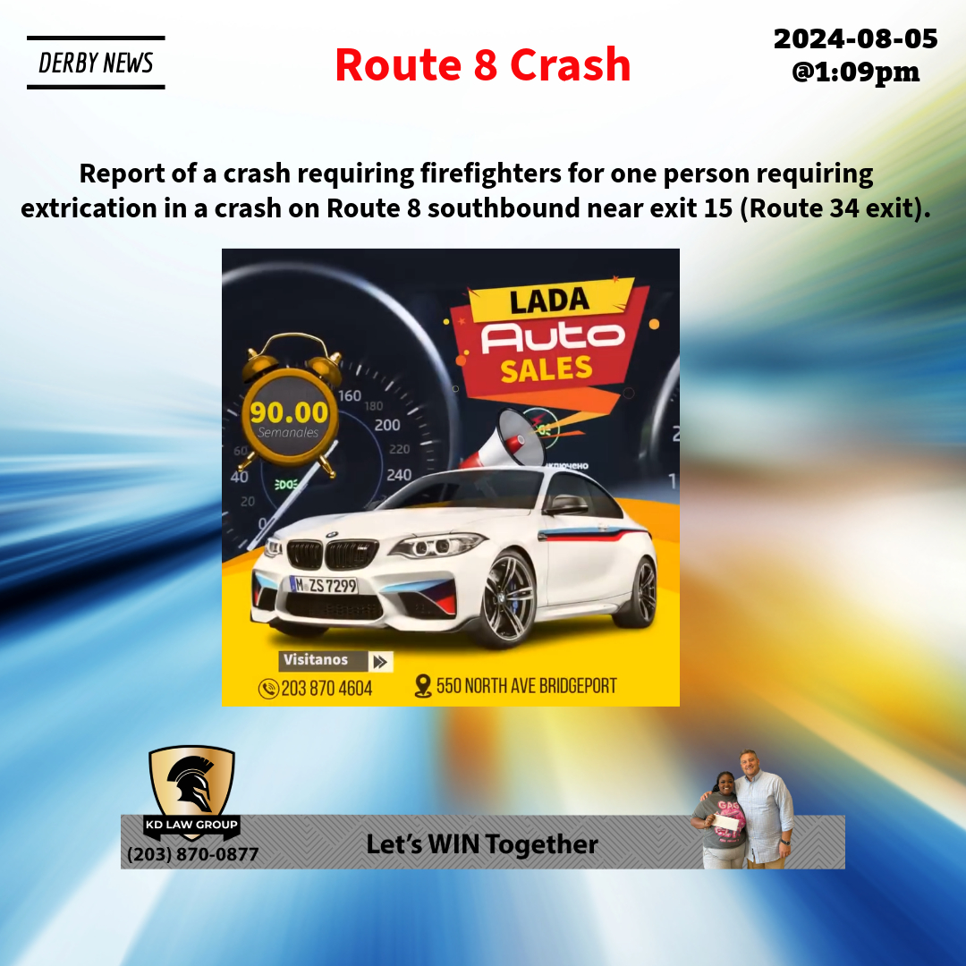 Report of a crash requiring firefighters for one person needing extrication in a crash on Route 8 southbound near exit 15 (Route 34 exit). 2024-08-05@1:09pm--#Shelton CT--#cttraffic