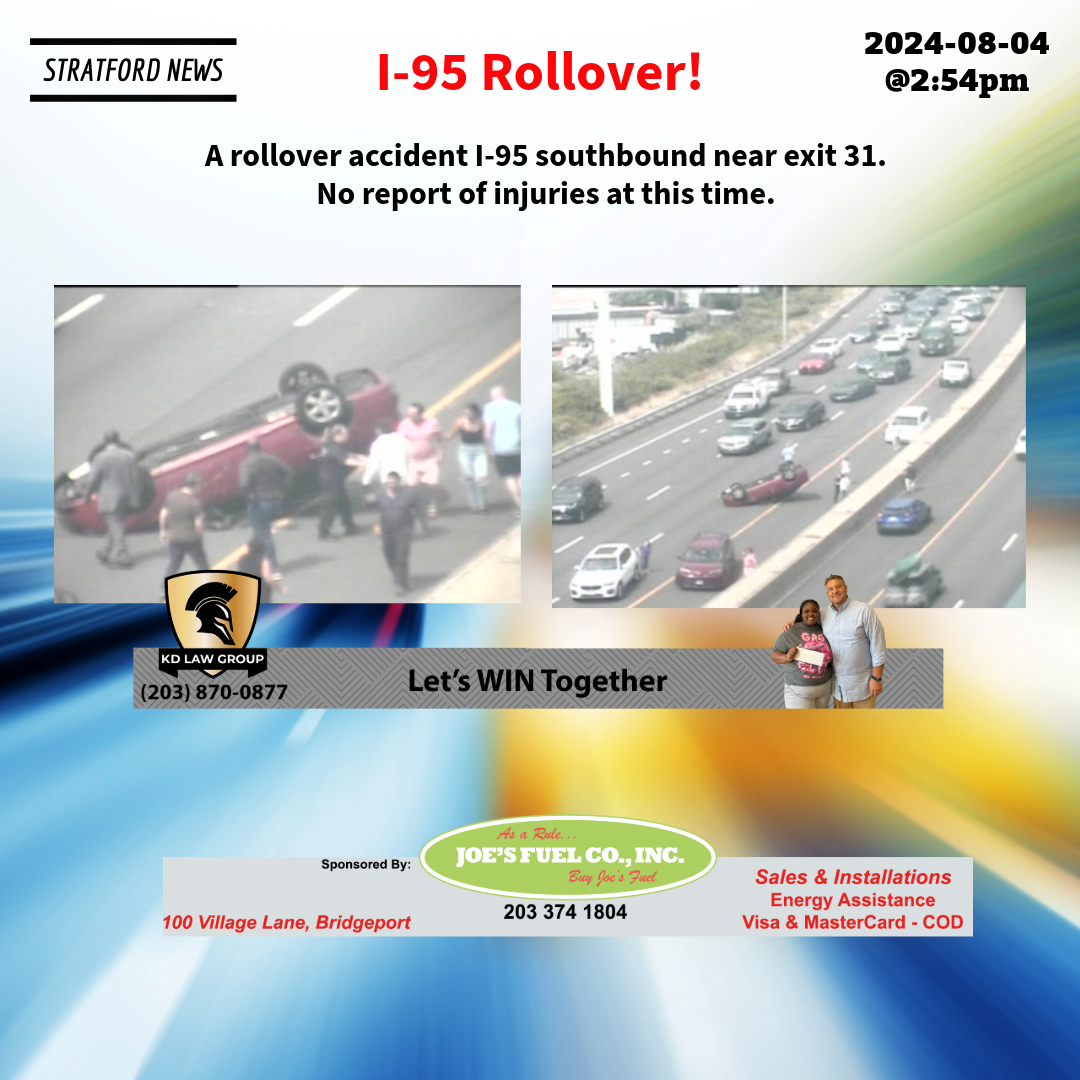 A rollover accident I-95 southbound near exit 31. No report of injuries at this time. 2024-08-04@2:54pm #Stratford CT-- #cttraffic