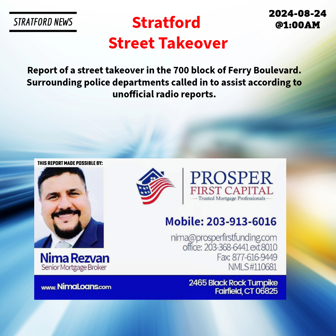 Report of a street takeover in the 700 block of Ferry Boulevard. Surrounding police departments called in to assist according to unofficial radio reports. 2024-08-24@1:00AM--#Stratford CT